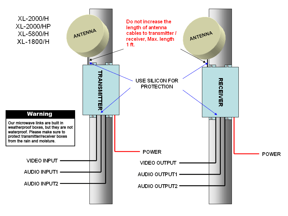 XLD-5800/H is an excellent, easy to use microwave link for 5.8 GHz. It comes with 5 W transmitter (XLD-5800/H) or 10 W Transmitter (XLD-5800/HP) with digital display to access any frequency from 5.690 MHz - 5.900 MHz, special receiver with digital display, 2 directional antennas PH-58 ; Capacity: 1 video/2 audio channels, receiver has built-in low noise amplifier for increased sensitivity. Operating frequency: synthesized. This link is Professional and it is recommended for TV production and Film. It is made for very long distances - up to 30 km + line-of-sight with higher gain antennas. Frequency setting is external and simple by push-buttons. Both receiver and transmitter are built in special weatherproof NEMA enclosures. The transmitter is self-adjustable in case that antenna is not properly matched.